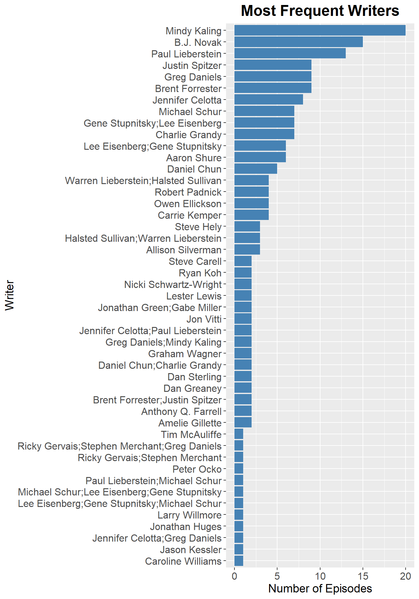Mindy Kaling received the most writer credits, with B.J. Novak and Paul Lieberstein rounding out the top group of writers.