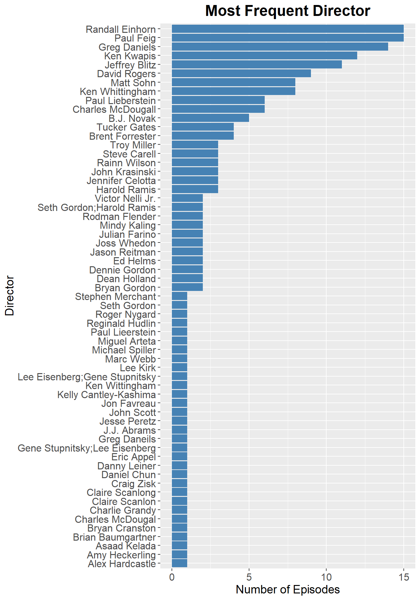 Randall Einhorn, Paul Feig, and Greg Daniels all directed over 12 episodes. There’s also a number of actors who got the chance to direct. B.J. Novak, Steve Carrell, Rainn Wilson, John Krasinski, Mindy Kaling, and Ed Helms all directed a handful of episodes each.