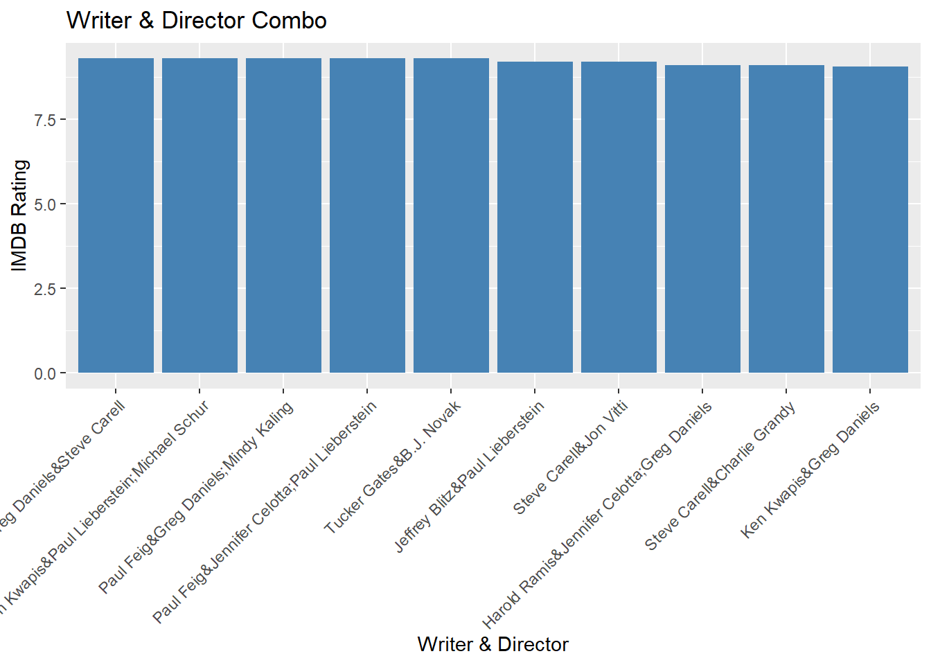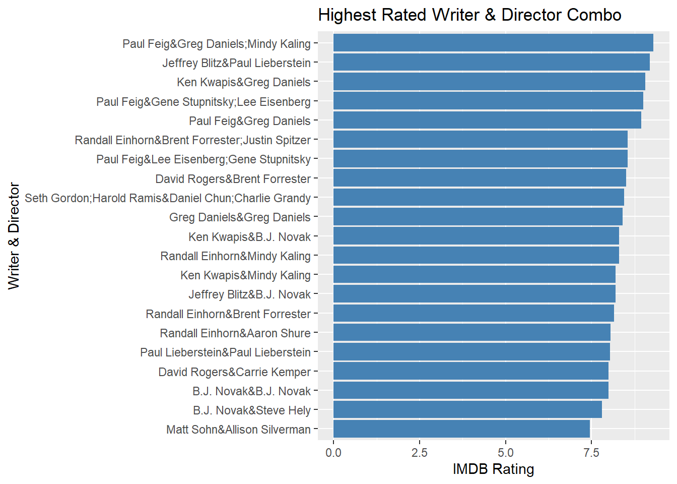 The same director and group of writers don’t work together that often. There are only five pairs of writers and directors who work with one another more than twice. Of those who worked together more than once, Paul Feig & Greg Daniels and Mindy Kaling had the highest average rating.